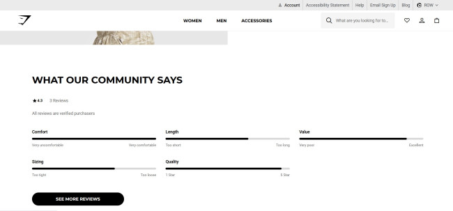 This strategy is also reinforced on Gymshark’s product pages, where star ratings and reviews are featured under “What Our Community Says”. Shoppers can see feedback about details such as fit, comfort, and performance. Together, the combination of influencer endorsements and authentic community reviews solidifies Gymshark as a brand that listens to and values its customers.