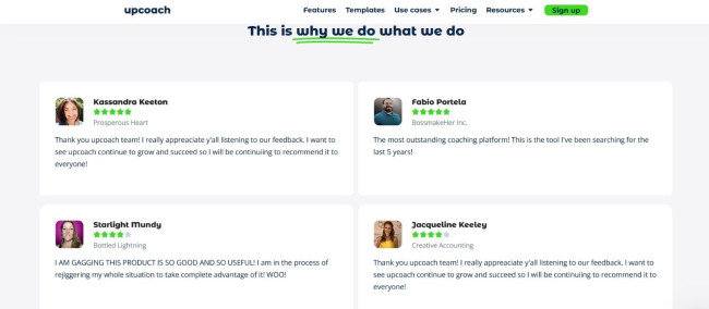Upcoach, a platform designed for coaches and trainers, is another great example of a brand that leverages the power of social proof in its marketing. Its website effectively incorporates testimonials to highlight its impact, with customer stories that showcase in detail how the platform has transformed their coaching businesses.
