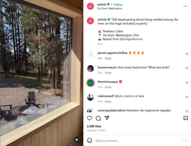 Airbnb makes use of user-generated content (UGC) to inspire wanderlust and attract followers. The company’s social media feeds showcase stunning travel photos created by users, highlighting exotic destinations and unique stays available on the platform. Posts are paired with quotes or engaging descriptions about the location to spark curiosity and even provide practical information for travelers interested in visiting.