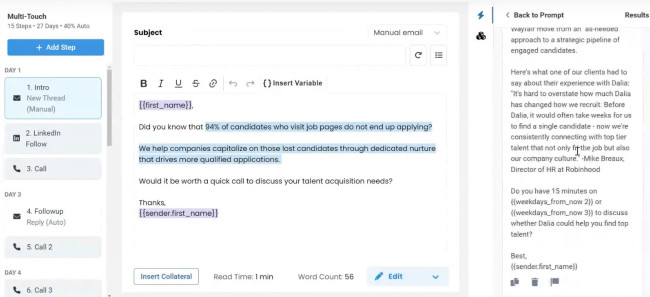 Within seconds, it generated a full multi-step sequence tailored to those inputs. While not perfect, it didn’t feel too robotic, and that’s important. It pulled from company data in my CRM to add real context and even suggested custom icebreakers using LinkedIn data. Each touchpoint felt like it was written by someone who understood both the audience and the sales context.