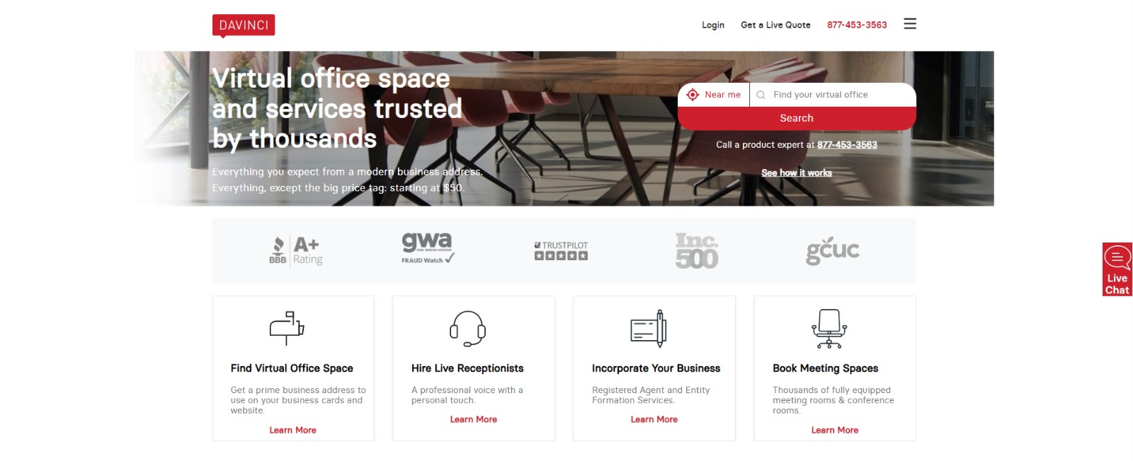 | Davinci Virtual | On-demand meeting rooms | From $49/month | Business address, mail forwarding, receptionist services, meeting room rentals |