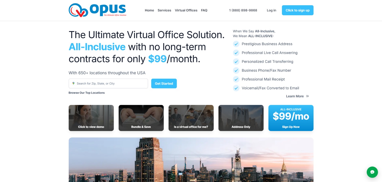 | Opus Virtual Offices | Budget all-inclusive virtual office | From $99/month | Address, live call answering, voicemail-to-email, phone number, mail receipt |