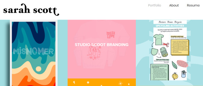 Sarah Scott, a designer from Atlanta, Georgia, showcases her talents and previous works in a simple and interactive way. All types of designs are featured on the homepage, so viewers can simply hover over the design they’d like to explore, and a button appears to take them to see more.