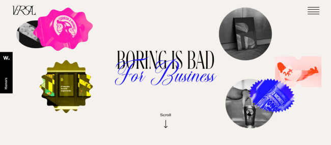 Versal Graphic Design portfolio bursts with energy — bold serif headlines meet flowing script, neon yellow and pink accents, and playful hover wiggles with “Discover more” prompts. Every interactive detail reinforces the studio’s “Boring is bad for business” mantra.