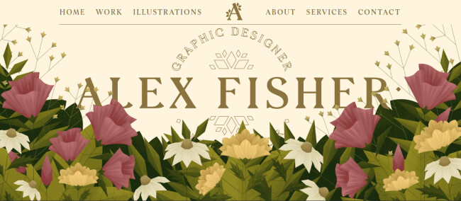 Alex Fisher’s portfolio spotlights her illustrations with a lush hero scene — textured blooms and foliage layered in parallax fade as you scroll, teasing her dual talents. Repeating those floral motifs sitewide and ending with a “Let’s work together” contact invite, it’s a seamless showcase of her signature style.