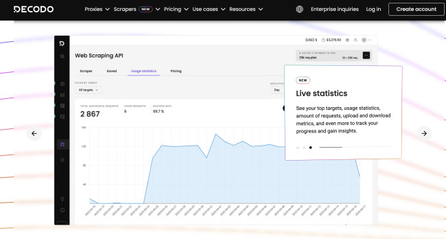 With a 99.99% uptime and a 99.48% success rate, Decodo ensures a smooth user experience with minimal disruptions. The service supports HTTP, HTTPS, and SOCKS5 protocols, making it compatible with various applications.