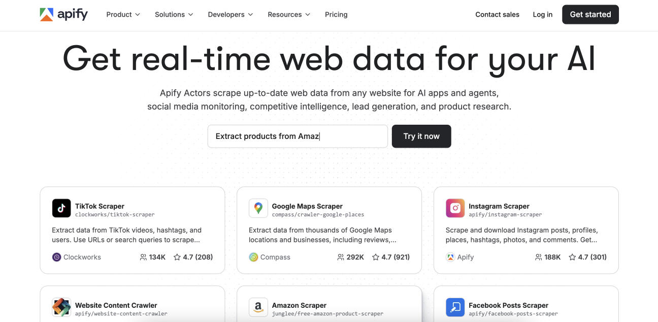 Its marketplace of ready-made scraping “Actors” helps users launch common data extraction tasks quickly, from eCommerce listings to social media data. This reduces setup time while still allowing room for deeper customization when needed.
