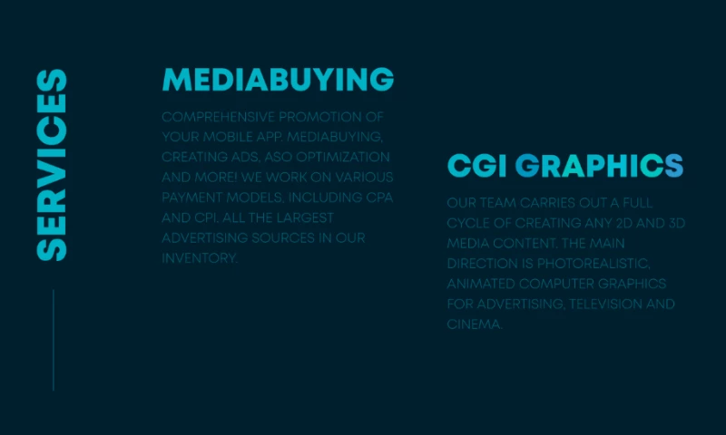 We also provide creative production services for banners, html5 banners, 2D/3D illustrations, 2D/3D motion design, UA creatives and ASO services.
