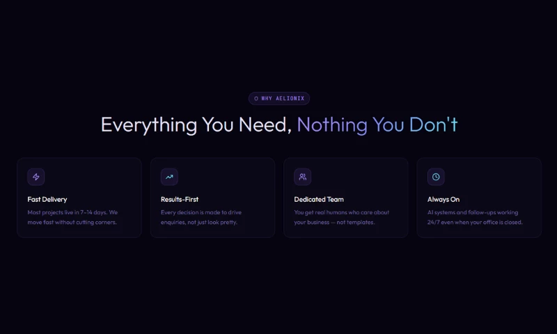 We specialise in five core services: custom web development, professional copywriting, data-driven SEO, AI automation, and brand identity. Our clients see an average of 3x more leads, 60% more clicks, and save 20+ hours a week through our custom AI systems.