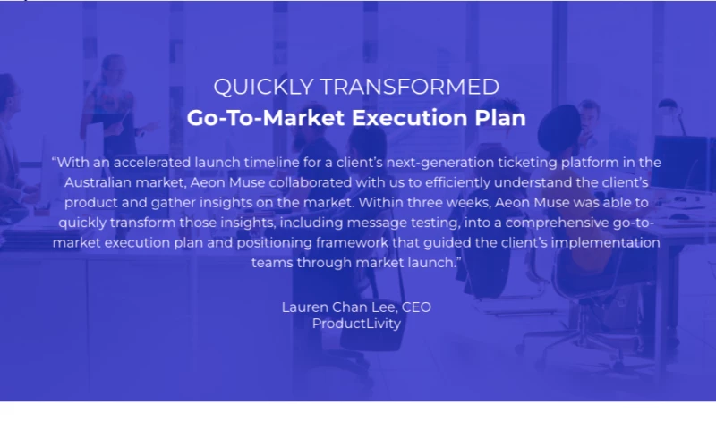 At Aeon Muse, we are here to help you meet mission-critical initiatives. We excel in understanding buyers and customers to refine your product-market fit. Through effective messaging and positioning, we inform, attract, and retain your target audience. We translate your vision and customer research into actionable tactics that drive success. With scalable planning and execution, we accelerate your go-to-market strategies.