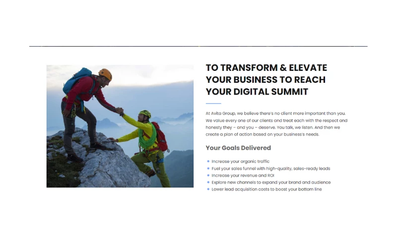 At Avita Group, we understand that success doesn't just happen - it's driven. We provide remarkable companies with the strategies they need to experience persistent growth and higher conversion rates. With our expertise in digital marketing, you can be sure your brand is accurately represented online while taking advantage of search optimization techniques to make more qualified leads convert into money! Let us help take your business goals up a notch by ensuring positive content dominates top results for searches related to you or your brand name. Our team knows how unlock potential ROI through powerful solutions tailored specifically for each customer’s individual needs – so what are you waiting for?