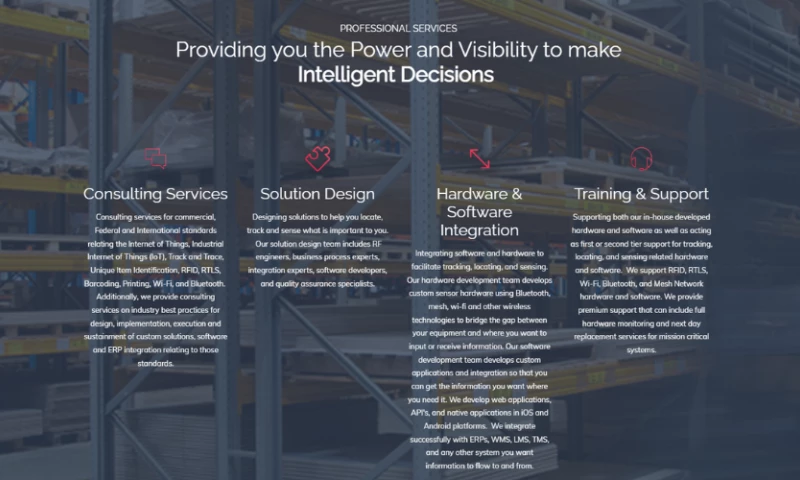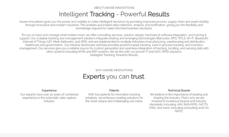 In order for you to track and manage what matters most, we offer consulting services, solution design, hardware & software integration, and training & support. Our scalable tracking and management solutions integrate existing and emerging technologies (Barcodes, RFID, RTLS, Wi-Fi, Bluetooth, Internet of Things (IoT), Mesh Networks, and GPS), and are implemented in multiple industries (manufacturing, warehousing and distribution, healthcare and government). Our intuitive ItemAware software provides powerful asset tracking, work in process tracking, and inventory management. Our services give you a reliable source for custom generation and seamless integration of tracking, locating, and sensing data with other systems including WMS and ERP systems. We do this with our proven IT and AIDC/RFID solutions that are backed by ISO 9001:2015 certified, ISO/IEC 2000-1:2011 certified, and SEI CMMI Maturity Level 3 audited processes.