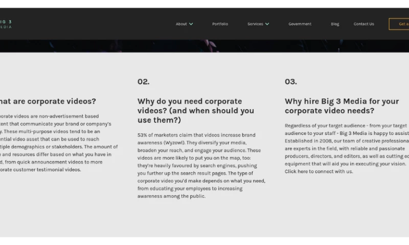 Big 3 Media stands out as the go-to Singapore Film & Corporate Video Production company, taking the weight off your shoulders in the intricate world of media creation. We aim to bridge the gap of creative uncertainties, offering a smooth and comprehensive journey for our clients.