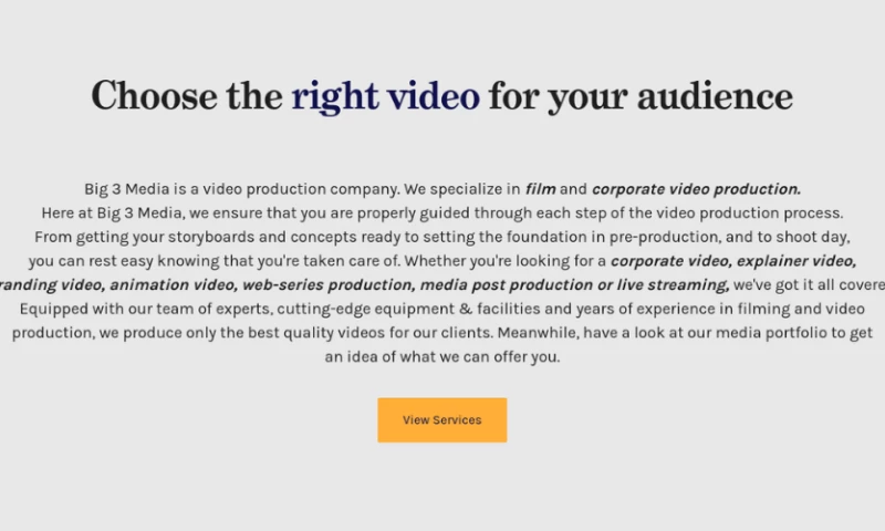 This is my second time round working with a video production company and I was very pleased with the experience and results provided by Big 3 Media! My objective was to produce a corporate video for my company and throughout the process, the team seemed experienced and was very responsive, friendly and patient - clearly explaining to me how to creatively align the video with my goals, what to expect and then delivering the video on time. The final video (after a few drafts) was professional and of high quality as well. Overall, I would definitely recommend Big 3 Media to anyone (especially first timers) who might be looking for a reliable video production company in Singapore. "Kwok Khim Liew's Review Sourced from Google