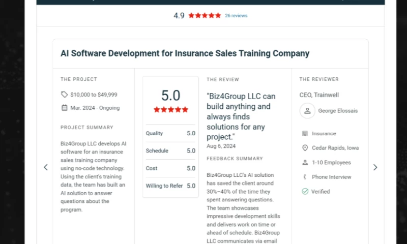 We've had an outstanding experience working with Biz4Group a Top AI Development Company. Their expertise and innovation greatly enhanced our platforms functionality, and the design layout they created for us is both outstanding and elegant. Their team is professional, communicates clearly, and delivers on time. We highly recommend Biz4Group for any businesses looking for Web development along with AI Integration. "Project Name: A Full Website Redesign