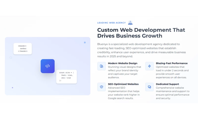 Today, Bluenyx stands as a recognized leader in custom web development and modern website design, known for creating blazing-fast, SEO-optimized websites that establish credibility and drive measurable business growth.