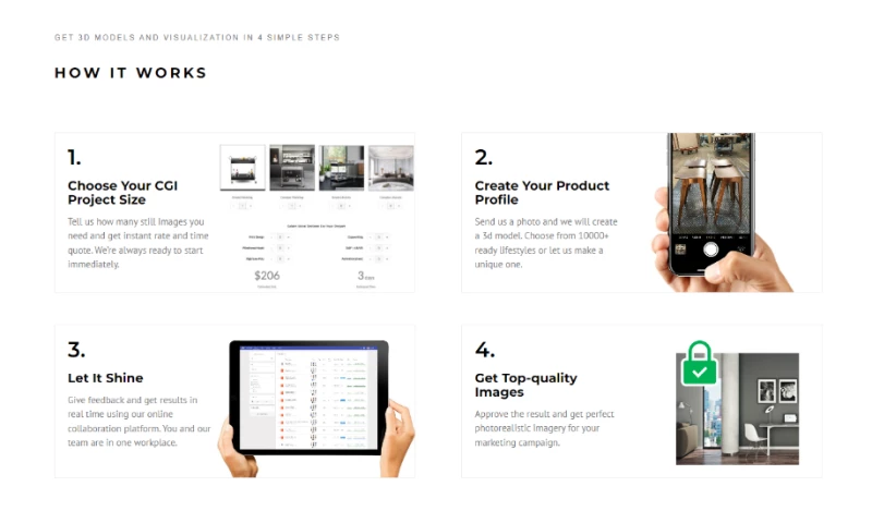Clientsincluding West Elm, Siemens, Mitsubishi, B&B Italia, Mohawk, and Floor & Decorleverage CGIFurnitures capabilities to streamline content production, reduce logistics, and maintain consistency across large product inventories. Typical projects are delivered within 15 business days, supported by agile project management and flexible revision processes.