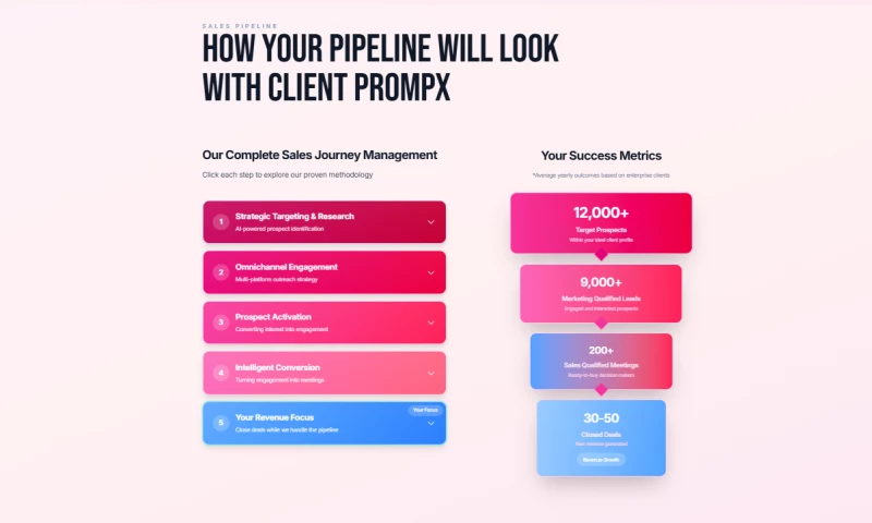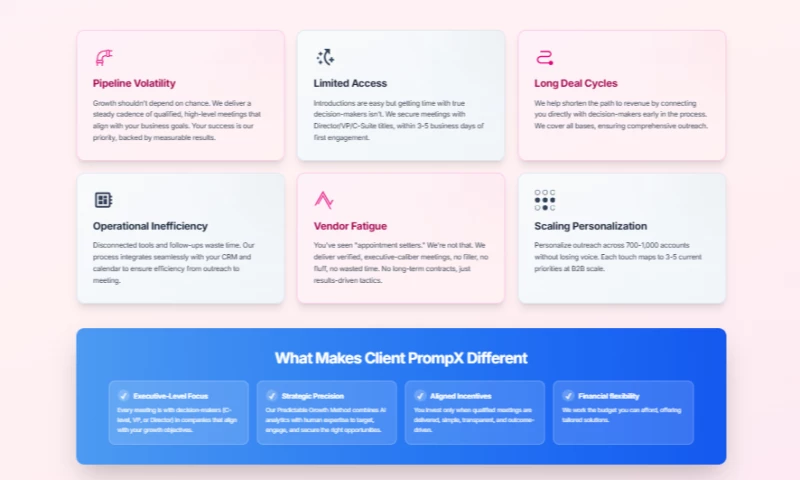 Through its five-step methodology targeting, omnichannel engagement, activation, conversion and relationship-building Client PrompX ensures each outreach campaign is strategic, relevant and performance-focused. The agency works across email, LinkedIn, phone, messaging platforms and other channels to drive conversations with directors, vice presidents and C-suite executives. With a pay-per-meeting model and guaranteed replacement for no-shows or unqualified appointments, Client PrompX offers a scalable, results-based solution for companies seeking consistent access to key stakeholders and a stronger sales pipeline.