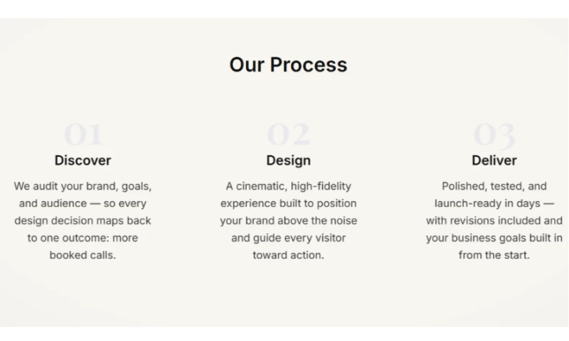 The visuals are cinematic and clean, but never distracting. The copy is simple and direct. The interactions feel smooth and intentional. The goal is always the same: make the brand look established, trustworthy, and ready for real business.