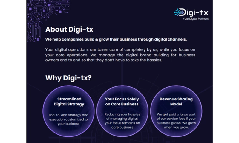 At Digi-TX, we believe that technology is more than just a toolit's a strategic enabler of success. Thats why we adopt a holistic approach to solving business challenges. From startups looking to establish their digital footprint to established enterprises aiming to innovate and scale, our solutions are tailored to meet the unique needs of each client.