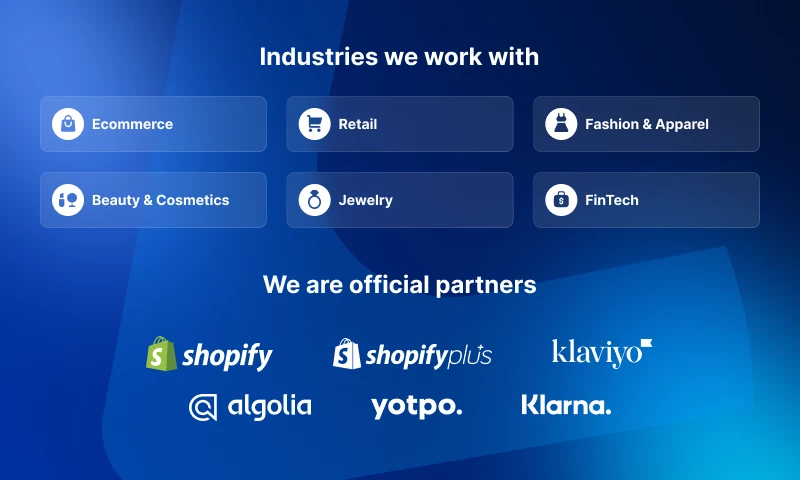 - We're official partners of Shopify, Shopify Plus, BigCommere, Klaviyo, Recharge, and Instant Commerce