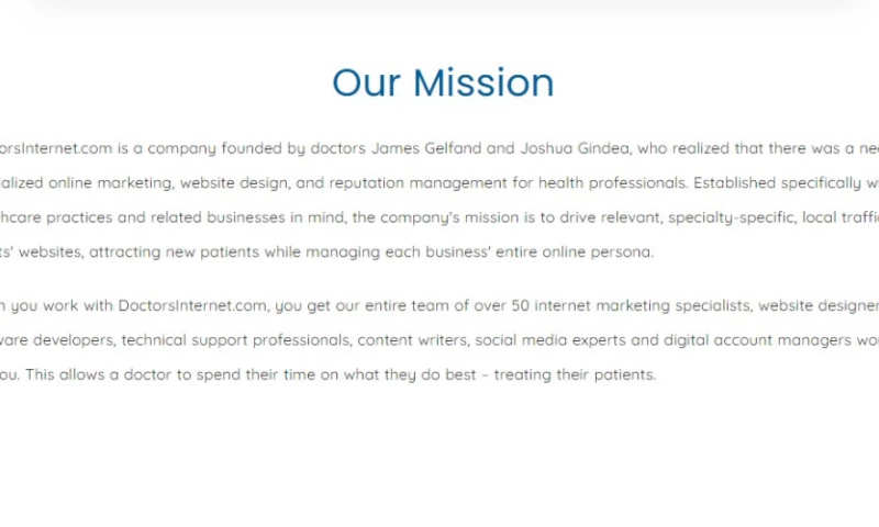When you work with DoctorsInternet.com, you get our entire team of over 50 internet marketing specialists, website designers, software developers, technical support professionals, content writers, social media experts and digital account managers working for you. This allows a doctor to spend their time on what they do best – treating their patients.