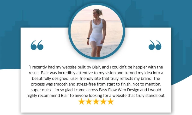 I really cannot recommend Blair from Easy Flow Web Design enough. I asked for a web page, and then realised I hadn't told him about something. For Blair, it was no problem. He built it beautifully. The logo he designed was just right! Such a professional business and Blair informed me every step of the way what's going on. Definitely five stars! "Lady Portia's Review Sourced from Google