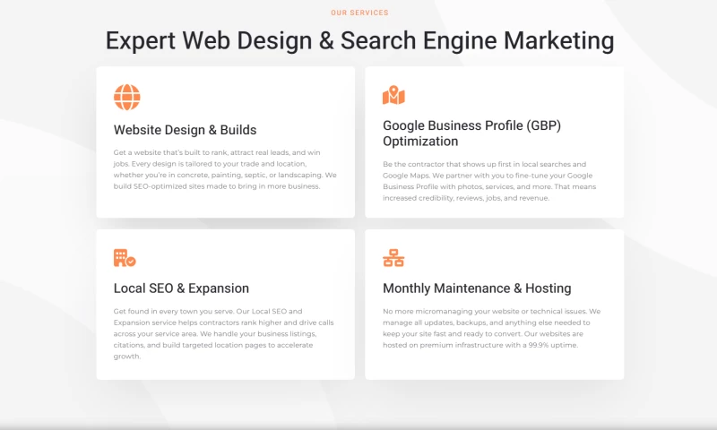 We specialize in Local SEO, Google Business Profile (GBP) optimization, and contractor-focused WordPress websites designed to convert visitors into clients. By combining proven search strategies with mobile-friendly, fast-loading websites, we ensure our clients stand out in both Google Maps and organic search results.