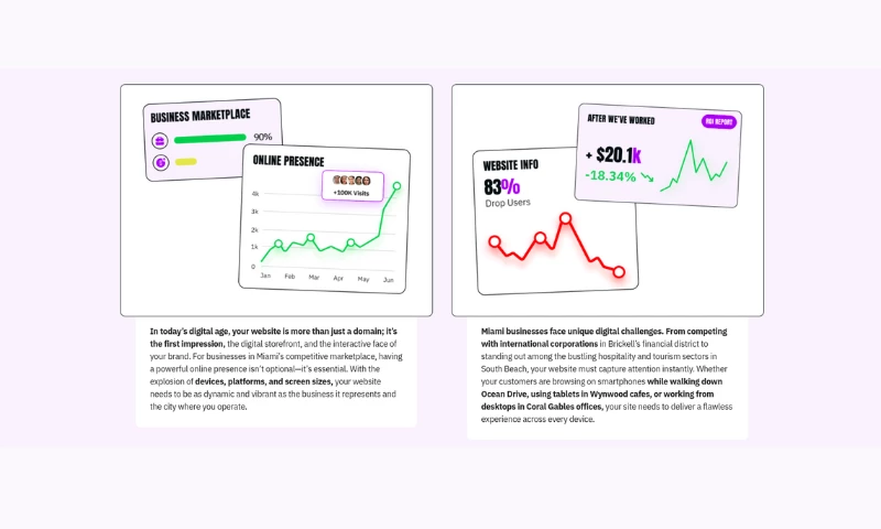 Our Miami web development approach combines cutting-edge technology with deep local market knowledge. We know that Miamis multicultural audience demands websites that are not only visually appealing but also culturally relevant, mobile-optimized, and lightning-fast. From responsive designs that adapt seamlessly to any screen size to user experiences that guide visitors toward taking action, we build websites that work as hard as you do.