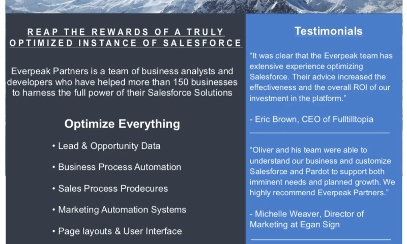 Since adopting Salesforce over a year ago, we knew we weren't taking advantage all that the system could do. We hired Everpeak Partners to revamp Salesforce and have been very pleased with the results. Our consultant took the time to learn about our unique business model and then guided us through the process of optimizing Salesforce. We added more automation, designed a new lead assignment process and improved reports / dashboards. We strongly recommend Everpeak Partners for anyone looking to get the most out of Salesforce. "Brian Chappell's Review Sourced from Google