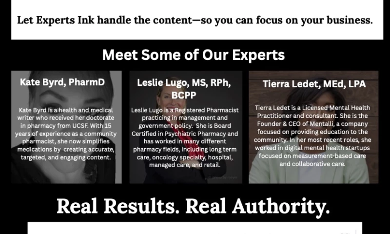Pharmacist, medical writer, and Experts Ink cofounder with 10+ years in pharmacy ops and compliance. I've written for top health brands like GoodRx, Pharmacy Times, Drug Topics, the National Psoriasis Foundation, Wolters Kluwer, and Carlat Report.