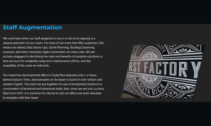 At First Factory, we offer staff augmentation as an extension of your current technology team, as well as project-based development for customized scopes of work.
