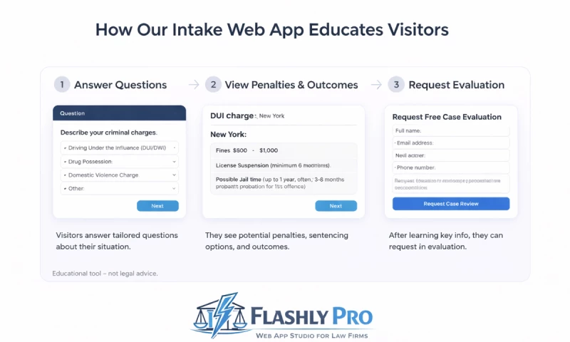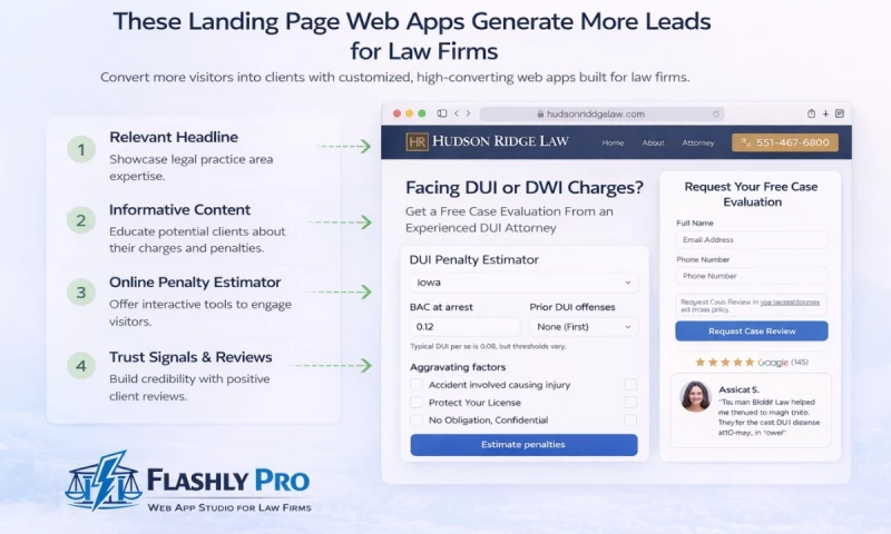 Examples include DUI penalty estimators, personal injury settlement range tools, and guided intake questionnaires. These applications help visitors understand what variables matter in their case while helping firms collect relevant information upfront.