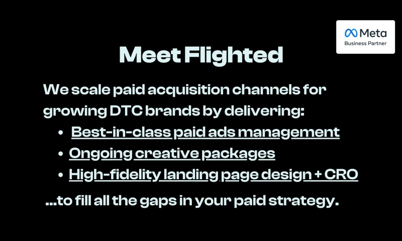 You're competing for the same eyeballs that the Warby Parkers and the Lululemons of the world are competing for! Execution across these 3 functions must be world-class. That's where Flighted comes in. By coupling performance marketing expertise with creative strategy and landing page design, we optimize every point of your acquisition funnel in tandem.
