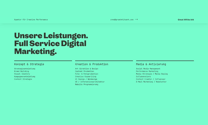 Great White Ark is a creative digital marketing agency based in Munich, specializing in high-performance, multichannel campaigns that drive visibility and business growth. With over 18 years of experience, the agency works with clients from a range of industries, including well-known global brands and local enterprises, helping them navigate the digital landscape with innovative and effective solutions. Their approach combines creativity, strategic insight, and a proven process tailored to each project, ensuring that every campaign resonates and delivers tangible results. Whether developing a new brand identity, executing a performance marketing strategy, or creating impactful media campaigns, Great White Ark crafts bespoke solutions designed to achieve clear business goals.