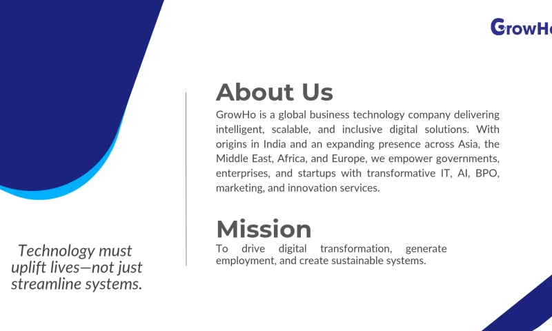 Headquartered in Pune, with operations in Mumbai, Dhule, and strategic global alliances, we are committed to sustainable growth, client success, and social impact. At GrowHo, we don’t just deliver services—we create opportunities, foster innovation, and build the digital future, one solution at a time