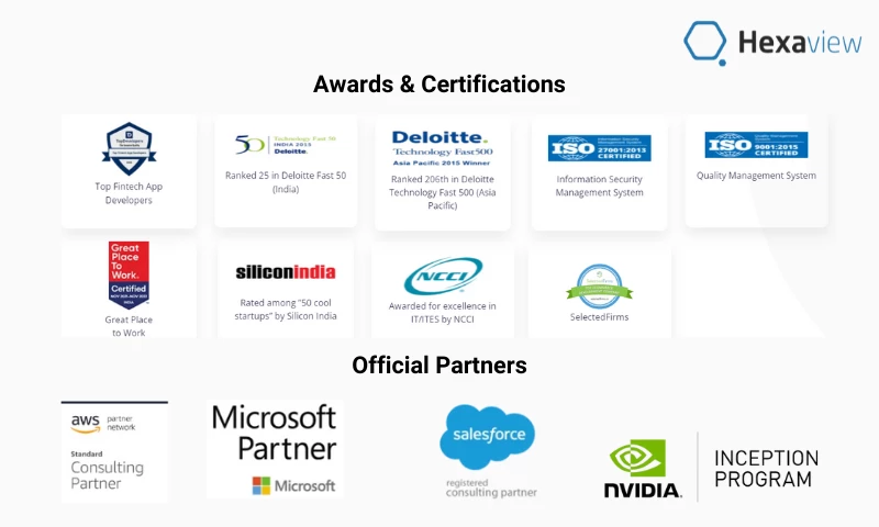 We are an ISO certified and Great Place to Work certified organization. Apart from this, Hexaview is an official partner to AWS, Microsoft, Salesforce, and NVIDIA Inception Program.