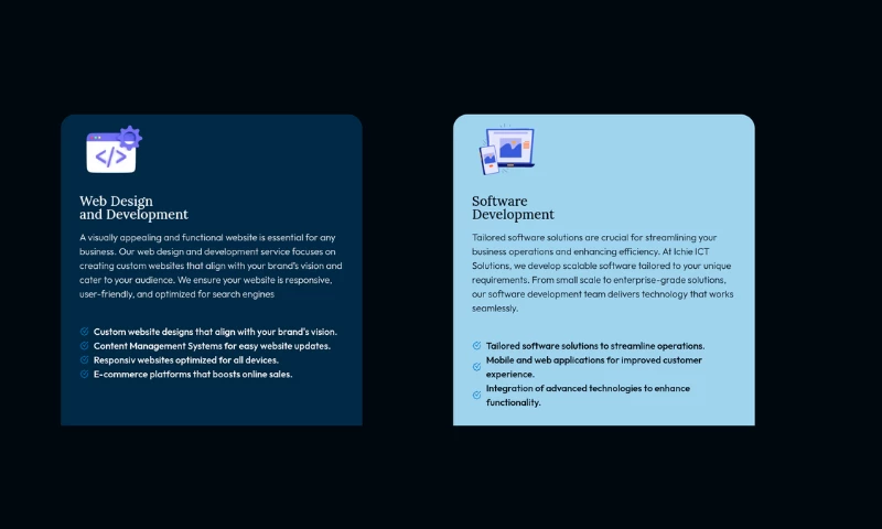 At Ichie ICT Solutions, we offer innovative development solutions, strategic design, and tailored experiences to help businesses grow. Our core services are;