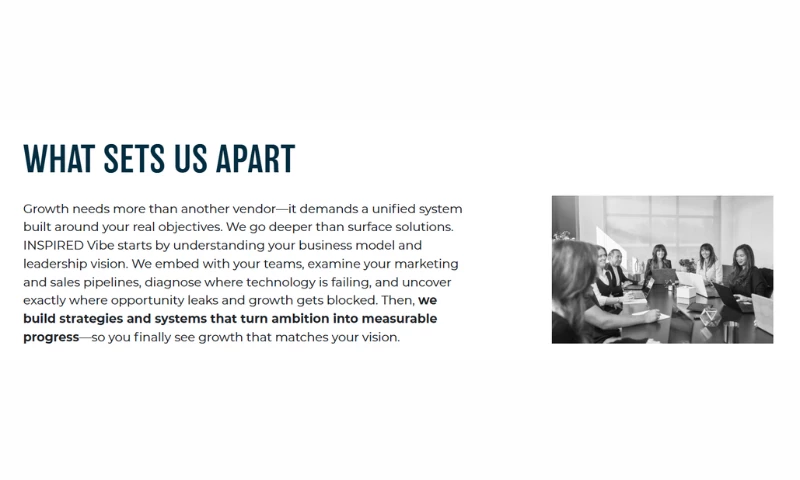Growth needs more than another vendor it demands a unified system built around your real objectives. We go deeper than surface solutions. Inspired Vibe starts by understanding your business model and leadership vision. We embed with your teams, examine your marketing and sales pipelines, diagnose where technology is failing, and uncover exactly where opportunity leaks and growth gets blocked. Then, we build strategies and systems that turn ambition into measurable progress so you finally see growth that matches your vision.