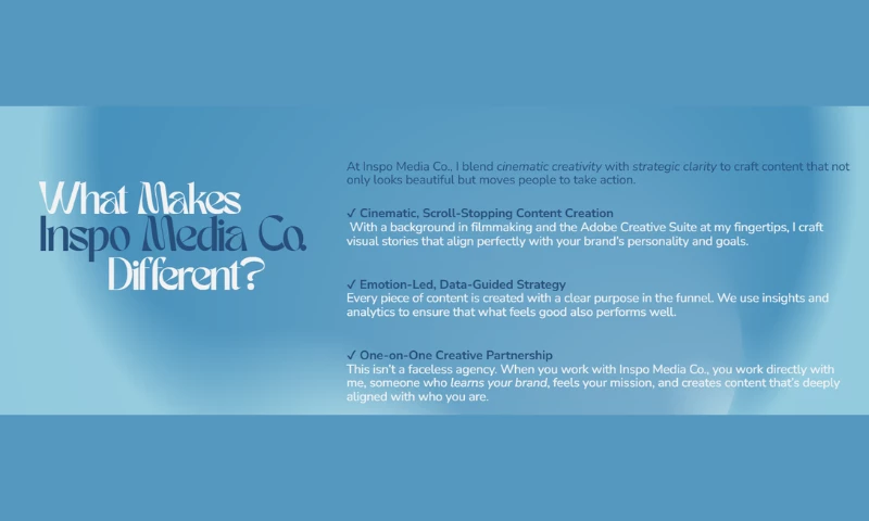 Founded on the values of soul over surface, cinematic precision, and scalable strategy, Inspo Media Co. is dedicated to empowering small businesses and creatives to build brands that leave a lasting mark not just online, but in culture at large.