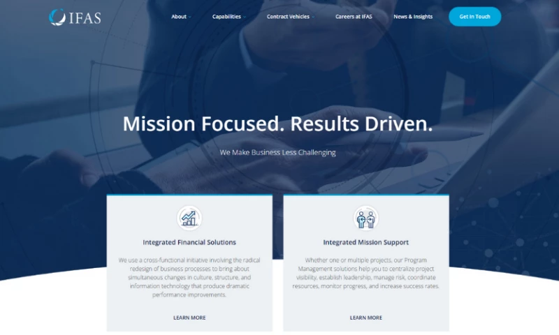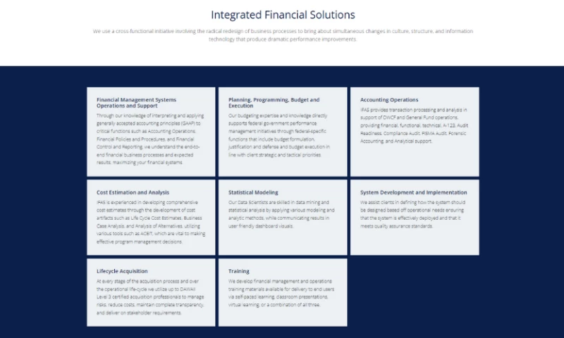 At IFAS, we are a professional services firm and much of what we sell is knowledge and expertise. Integrated Finance and Accounting Solutions is not just our name it is the overarching philosophy that we incorporate in our program support analysis for every engagement. We are a company committed to delivering on time service that is within budget.