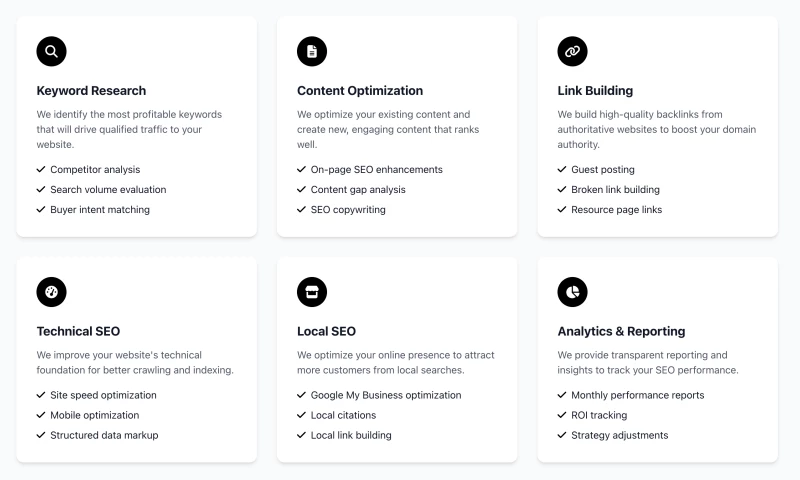 - Analytics & Reporting providing transparent monthly reports, ROI tracking, and actionable insights for ongoing success.