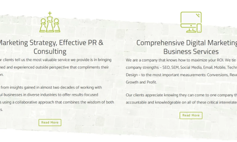 Services include SEO, SEM, Mobile Optimization, Email Marketing, Social Media, and Design & Development.