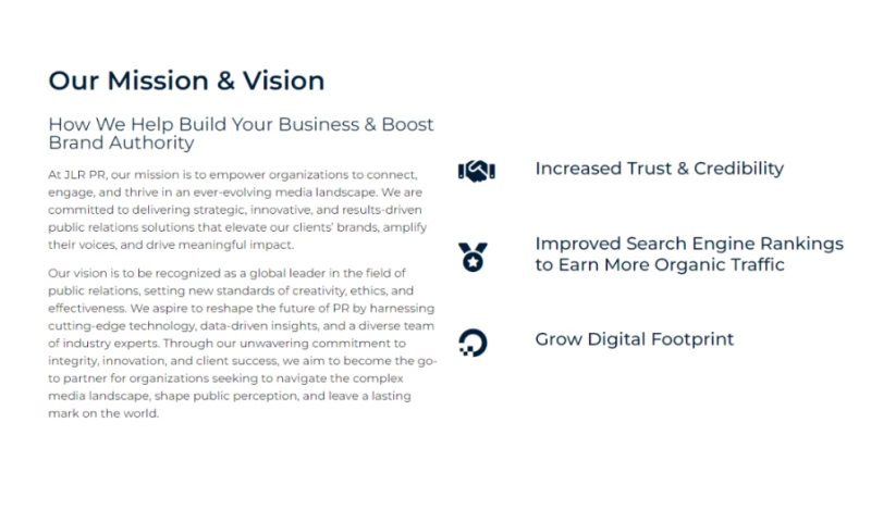 At JLR PR, our mission is to empower organizations to connect, engage, and thrive in an ever-evolving media landscape. We are committed to delivering strategic, innovative, and results-driven public relations solutions that elevate our clients brands, amplify their voices, and drive meaningful impact.