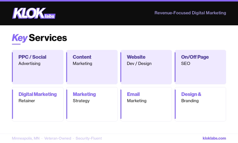 As a veteran-owned business, Klok Labs brings discipline, integrity, and a mission-oriented work ethic to every project. Whether partnering with emerging businesses or established brands, the agency is built to deliver innovative, secure, and scalable digital marketing solutions.