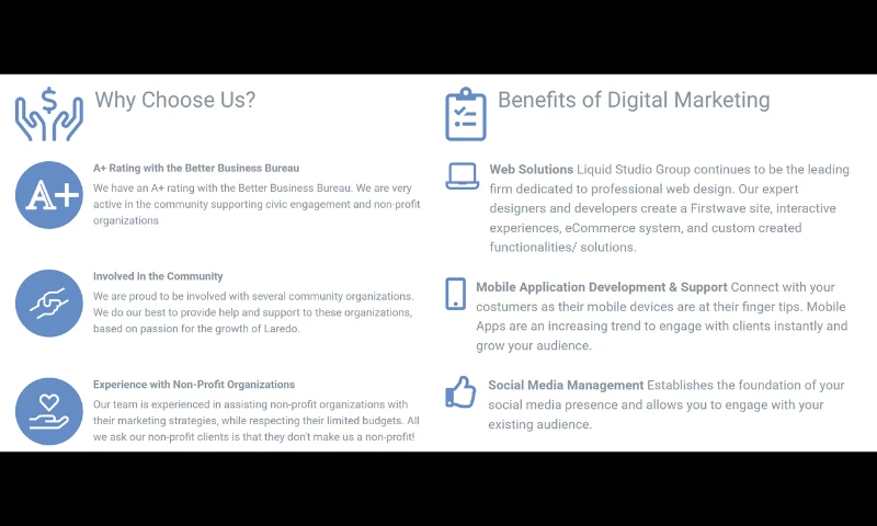 Liquid Studio Group is Laredo, Texass First Digital Marketing Firm specializing in online marketing, web design and development, graphic design, multimedia marketing, traditional advertising, print and promotional products.