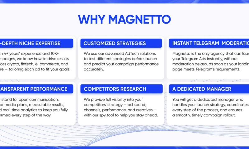 Were also your go-to partner for managing and optimizing ads across Telegram Mini Apps, Google, YouTube, Meta, TikTok, X, and Reddit. Just reach us out - the Magnetto.com team is here to help you reach your marketing goals.