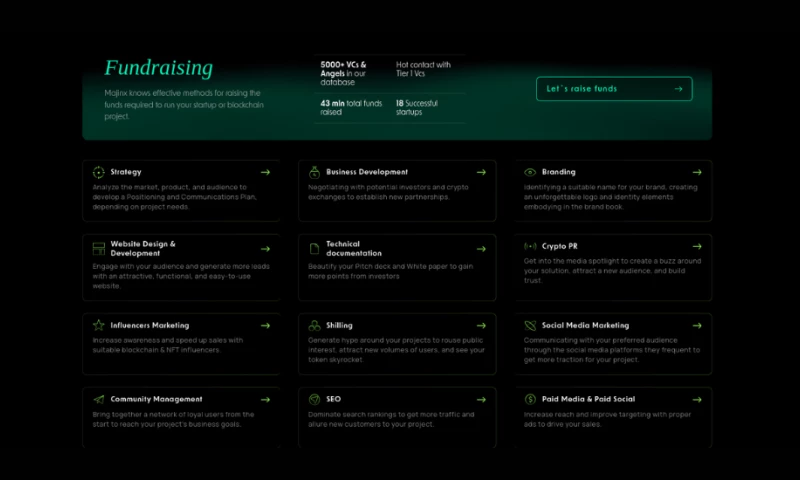 Majinx is the go-to digital agency for success in blockchain markets.Our team of marketing and business development experts provides a suite of tailored services to DeFi, GameFi, NFTs, and ICO/IDO projects, empowering them to unlock their true potential across cryptocurrency networks.