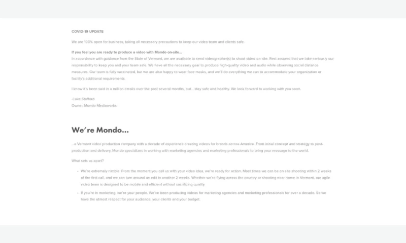 …a Vermont video production company with a decade of experience creating videos for brands across America. From initial concept and strategy to post-production and delivery, Mondo specializes in working with marketing agencies and marketing professionals to bring your message to the world.