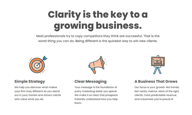 - Strategy Sessions: Working sessions where we dig into how your firm makes money, uncover what makes you different from every competitor in your market, and build your messaging and strategy around it.